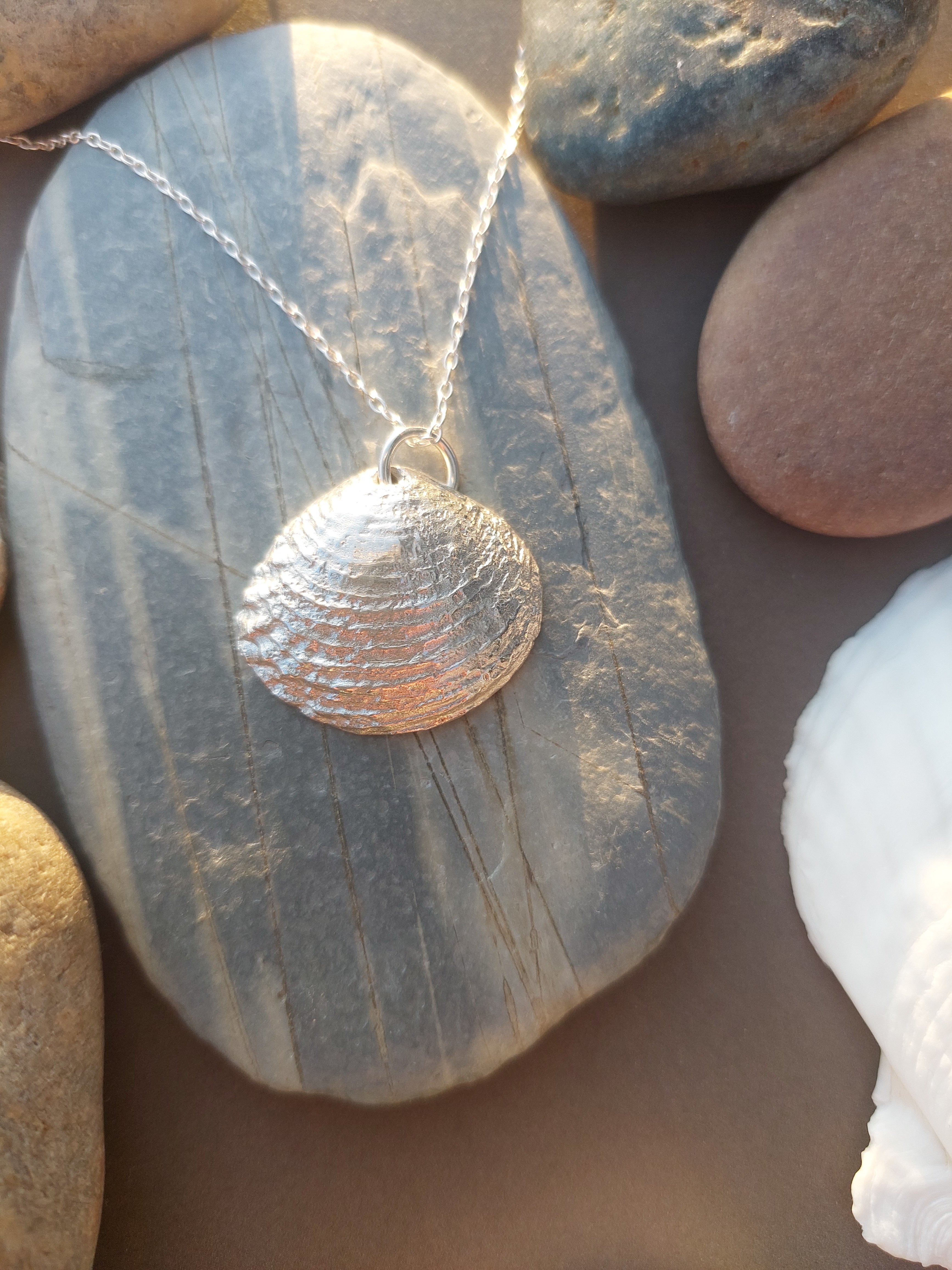 This Silver Venus Clam Necklace is a stunning, nature-inspired piece that brings the elegance of the ocean to life. Handcrafted in sterling silver, the necklace features a delicately cast Venus clam shell, with fine detailing that highlights the natural beauty of the shell’s smooth curves and textured surface. The lustrous finish enhances the sophisticated appeal, making it a perfect statement piece for both casual and formal occasions. Suspended from a sleek silver chain, this necklace captures the essence of coastal charm, offering a timeless and versatile addition to any jewellery collection.